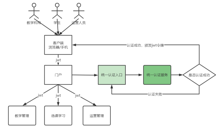 - 项目包括学生、学习机构的老师、平台运营人员三类用户,三类用户将使用统一的认证入口