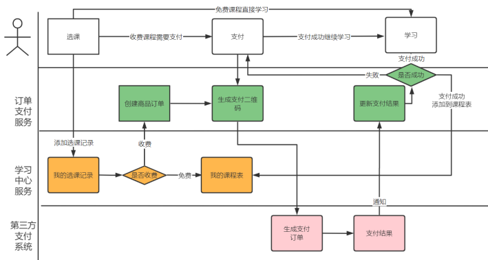 - 对于收费课程:创建选课记录后,需要下单支付成功后,自动向我的课程表添加记录
