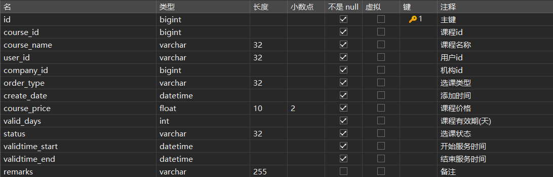 - 对于收费课程:按课程的现价、有效期确定开始服务时间、结束服务时间、选课状态为待支付