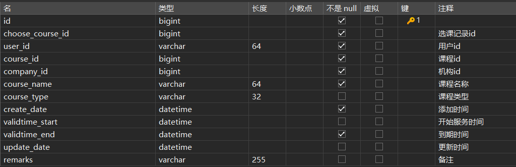 - 选课记录表结构