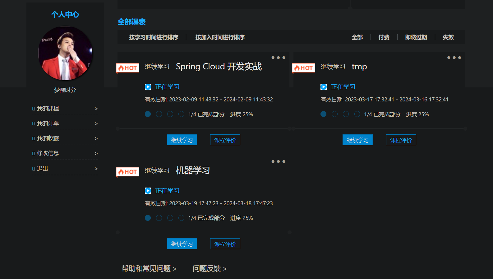 - 我的课程表:记录我在网站学习的课程,我的课程表中有免费课程和收费课程两种