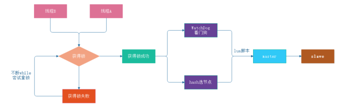 - 线程去获取锁,获取失败:一致通过while循环常事获取锁,获取成功后,执行lua脚本,保存数据到redis