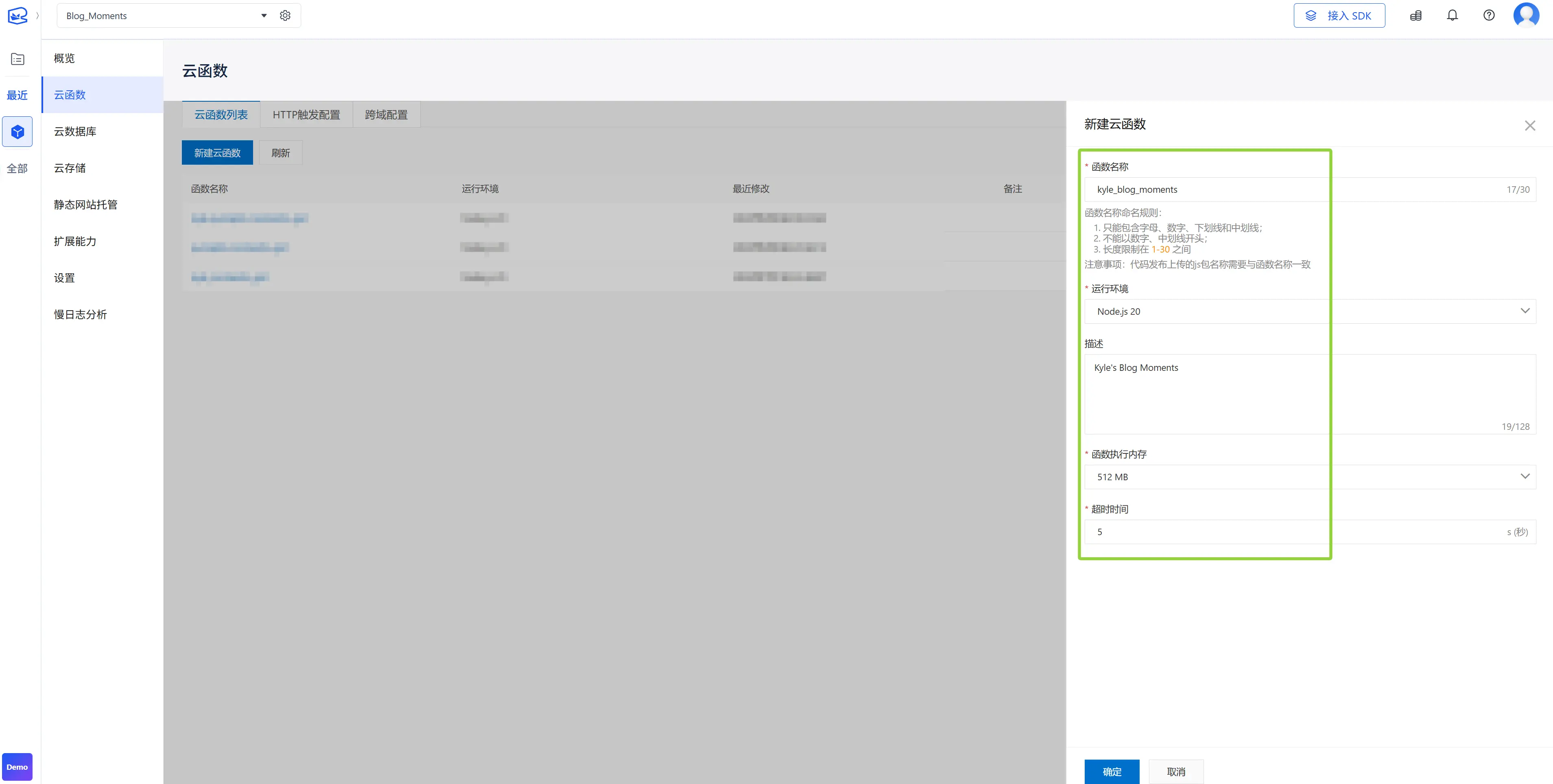 - 选择函数执行内存,目前支持128M,256M,512M,1024M,2048M。